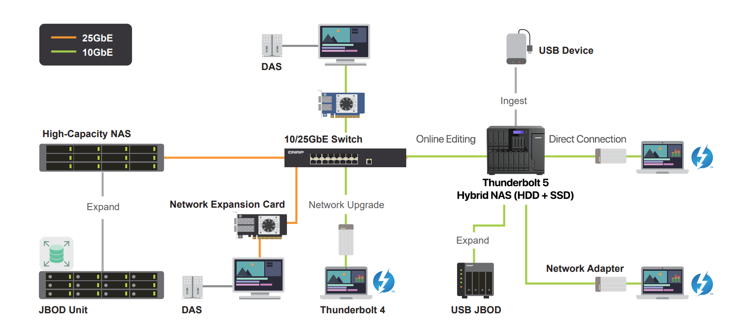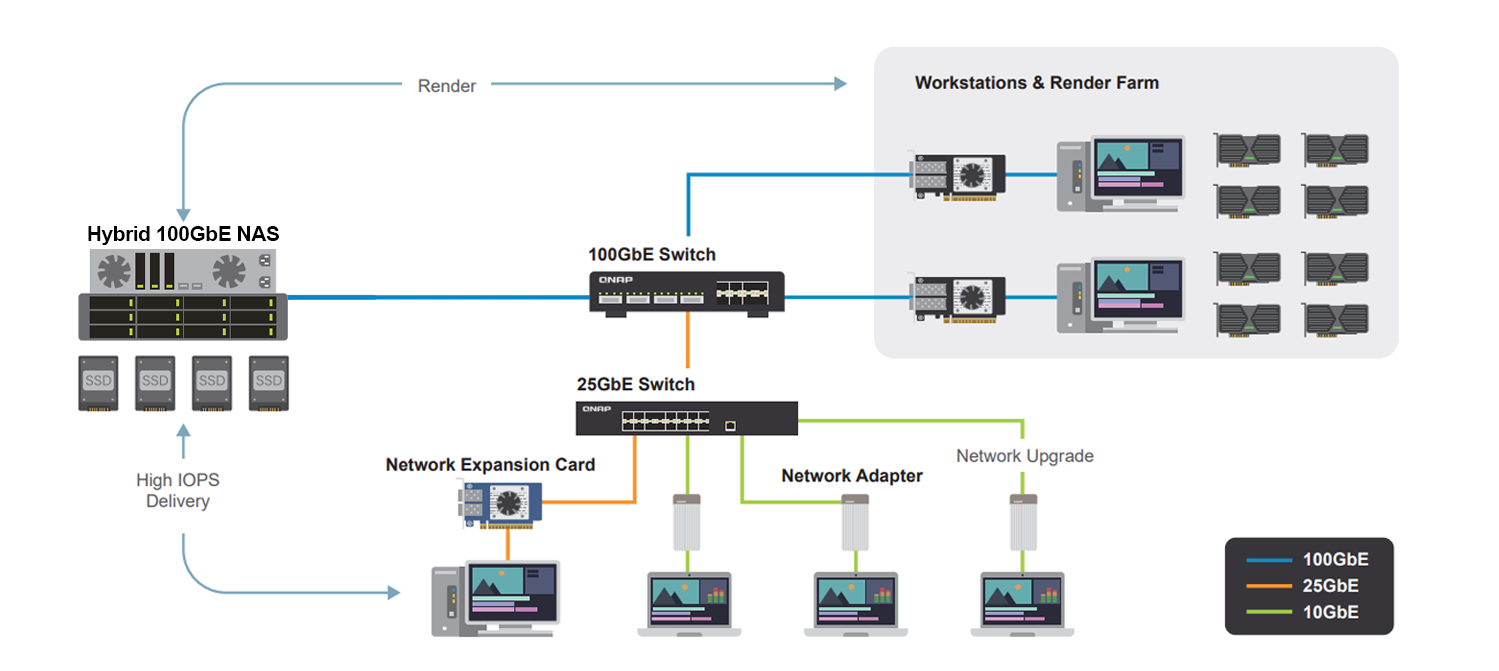 QNAP offers a complete 10GbE, 25GbE, and 100GbE ecosystem including NAS, switches, and expansion cards. This enables studios to scale network performance as needed, supporting multi-editor access, render farms, and large file transfers without introducing unnecessary complexity or cost.
